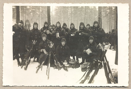 Pirmo manevru laiks. Dreiliņu apkārtne. Karavīri ziemas kaujas tērpos un 1930. gada parauga ziemas darba cepurēs. Priekšplānā redzamas britu šautenes R.-E.14