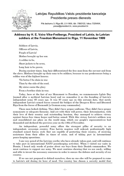 Address by H. E. Vaira Vike-Freiberga, President of Latvia, to Latvian soldiers at the Freedom Monument in Riga, 11 November 1999