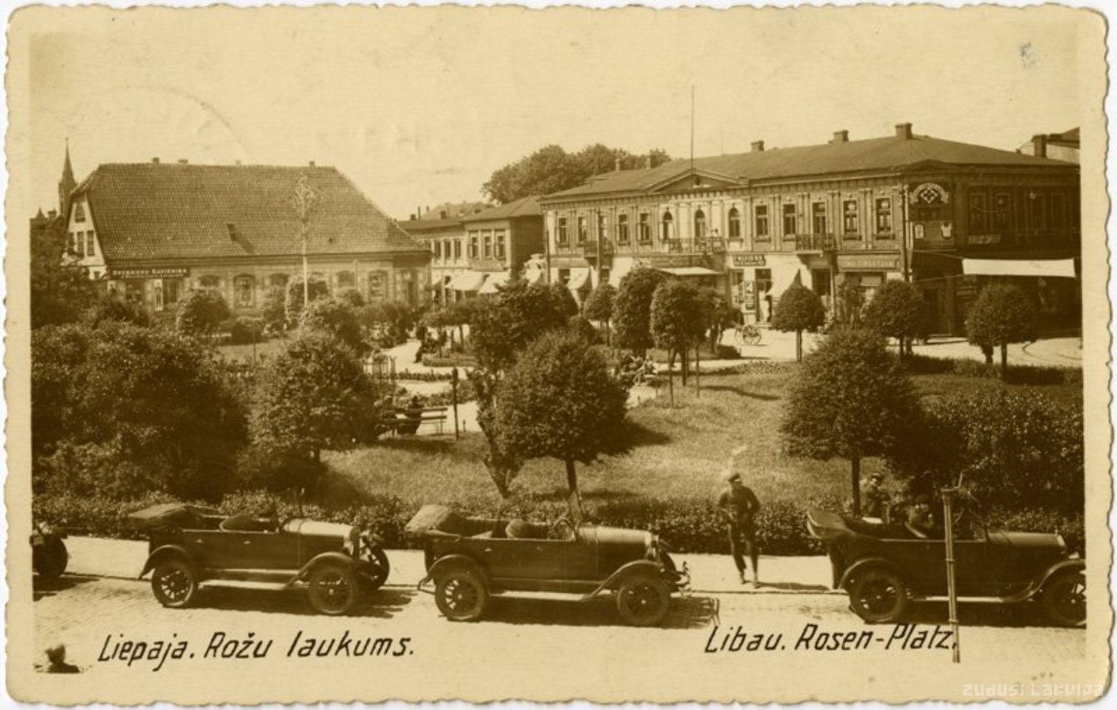 Atklātnes apakšējā kreisajā stūrī uzraksts: "Libau - Rosen - Platz."