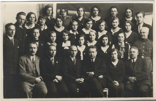 Alūksnes ģimnāzijas skolotāji un skolēni. K. Paucītis 2. rindā pirmais no labās. Grupas portrets