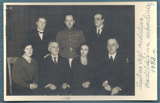 Pasākuma vadītāji, viesi un mākslinieki 1933. gadā. No kreisās: V. Eglītis, Neimaņa kundze, J. Rupais. Aizmugurē: K. Martinsons, pulkvedis K. Priedītis un mākslinieks Neimanis