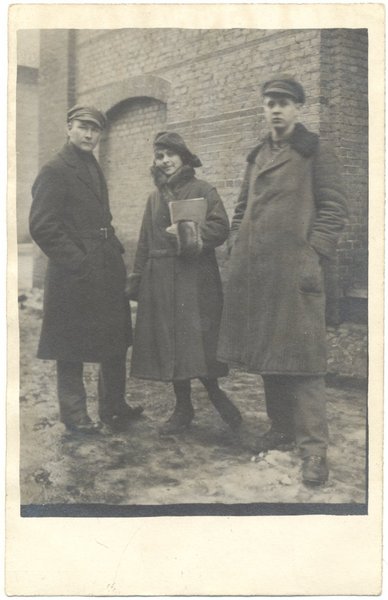 E. Bramberga, vēlāk aktrise, dzejnieka Pāvila Vīlipa sieva, ar jauniešiem skolēnu cepurēs pie Centrāltirgus spīķera. Grupas portrets. Centrāltirgus. Cepures. Mēteļi