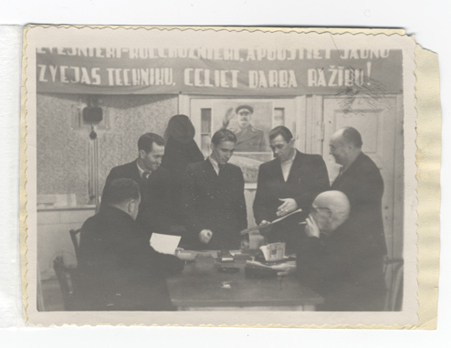 Apspriede pie galda. Personas nav atpazītas, domājams, kolhoza vadība. J. V. Staļina portrets. Lozungs padomju patriotisma garā. Telpas iekārtojums. Kolhozs "Jūras arājs" atradās Mazirbē