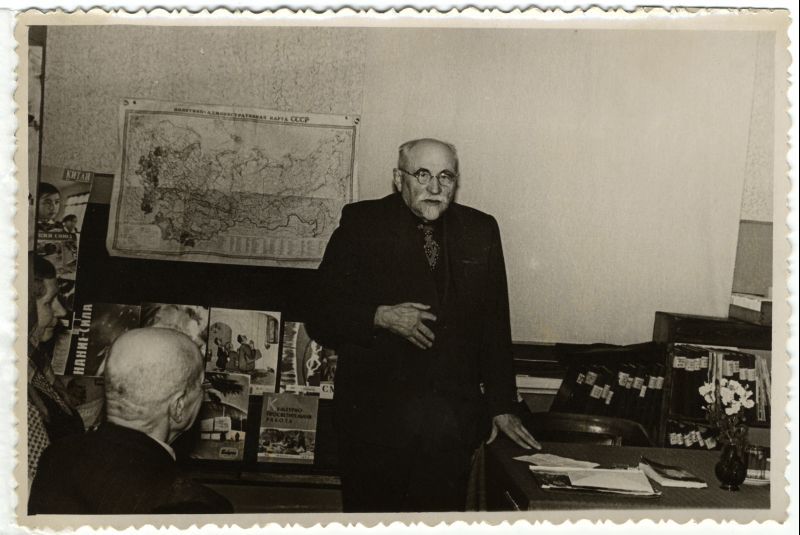 Pedagogs A. Skroderis publiski saka runu. Telpā atrodas grāmatas un dokumenti. Galds, krēsls, vāze ar ziediem. Pie sienas PSRS politiski-administratīvā karte