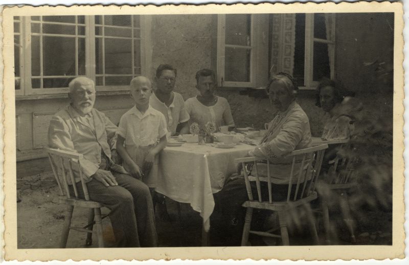 Andrejs Jankavs, literāts un tautiskā atmodas laikmeta darbinieks, sēž pirmais no kreisās, pa labi dēli Haralds un Visvaldis, pretim sieva Karolīna. Pusdienošana. Krēsli
