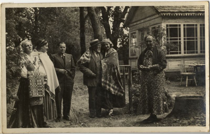 Apsveicēji, daļa no viņiem tautas tērpos, sapulcējušies mājas pagalmā. Andrejs Jankavs, literāts un tautiskā atmodas laikmeta darbinieks, - centrā apņemts ar seģeni. Mājas veranda. Viesības. Grupas portrets