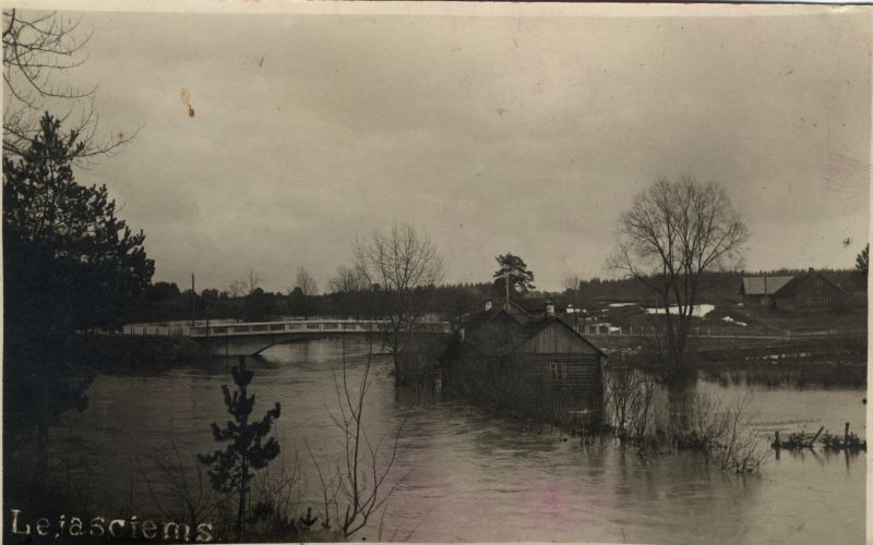 Tirzas upe pie Lejasciema pavasara plūdos. Mājas. Koki