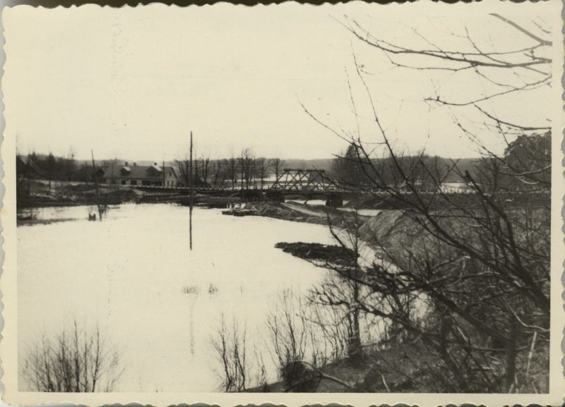 Tirzas upe pie Lejasciema pavasara plūdos. Tilts. Mājas