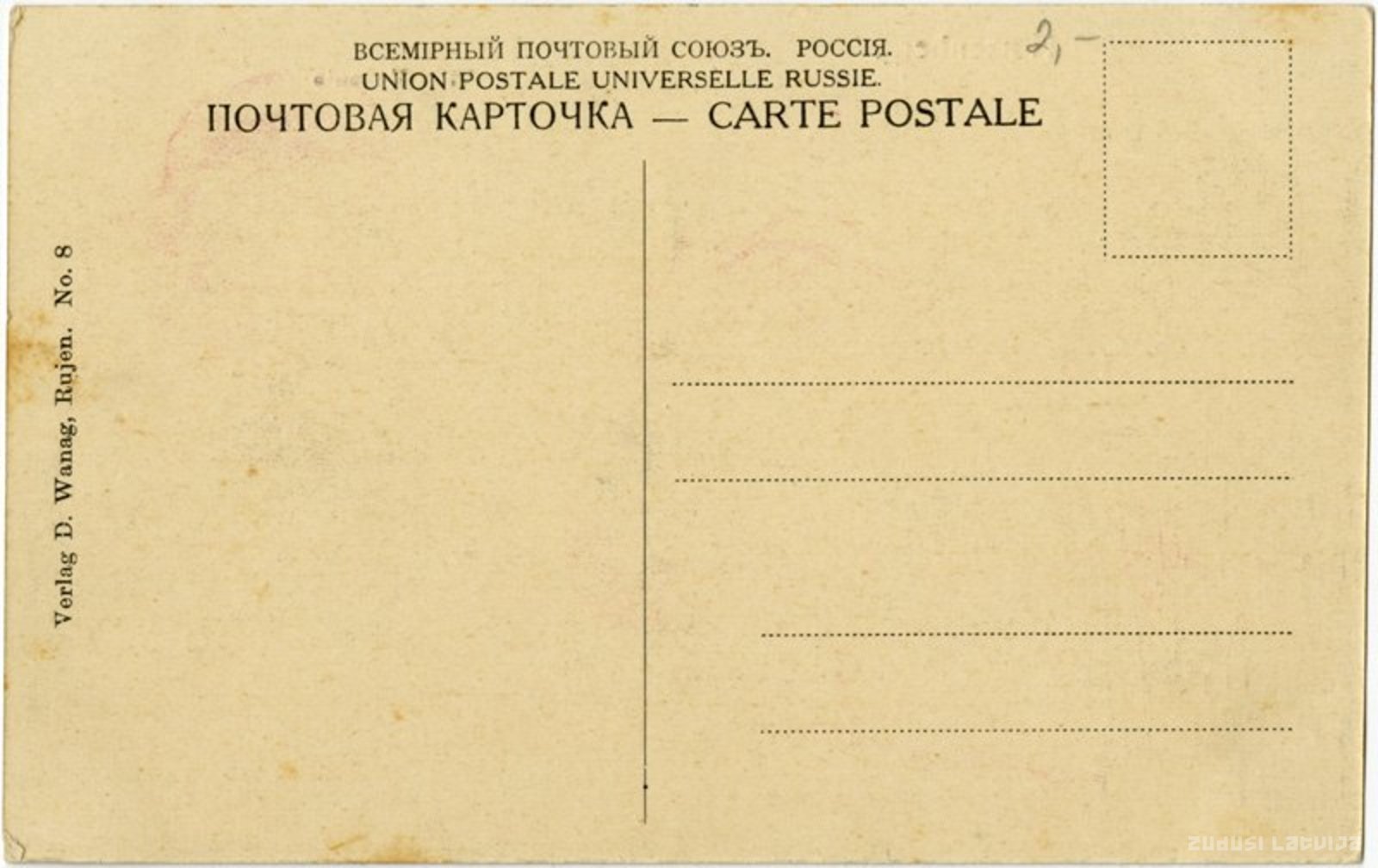 Atklātnes otrajā pusē ziņas par izdevniecību: "Verlag D. Wanag, Rujen. No. 8"
