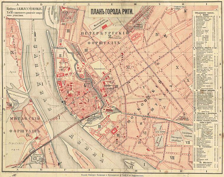 Rīgas plānā uzrādīti miertiesu apgabali, administratīvās ēkas, mācību iestādes, slimnīcas, nabagmājas, teātri, galerijas, redakcijas, baznīcas, klubi, viesnīcas, cirks