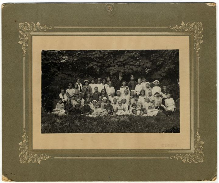 Orlas bērnu dramatiskās studijas dalībnieki zaļumos. Anna Lāce ar meitiņu Dagmāru 2. rindā 4. no labās. Elvīra Bramberga pēdējā rindā 7. no kreisās