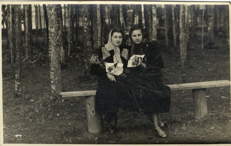 Vēsturnieka J. Zemzara māsas Hortenzija Medne (dz. Zommere, pa kreisi) un Ņina Lidija Zommere mežmalā uz soliņa