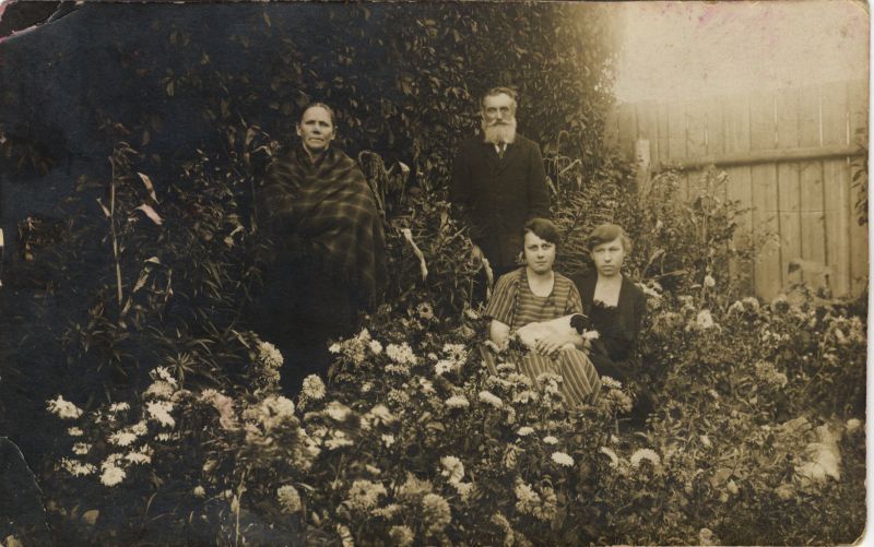 Stāv Anna un Kārlis Zommeri. Sēž viņu meita Hortenzija Medne un kāda viešņa ar sunīti