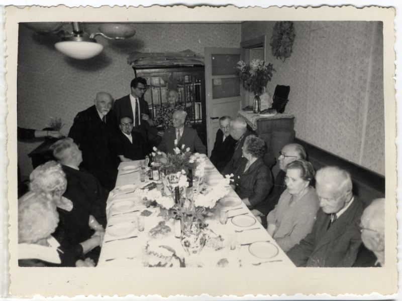 A. Skroderis stāv pirmais no kreisās. Svētku galds. Ziedi. Grāmatu skapis