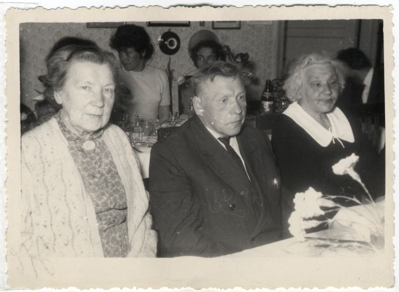 M. Skrodere, skolotāja A. Skrodera sieva, kreisajā pusē. J. A. Jansons, literāts un folklorists, vidū. Pie viesību galda. Ziedi