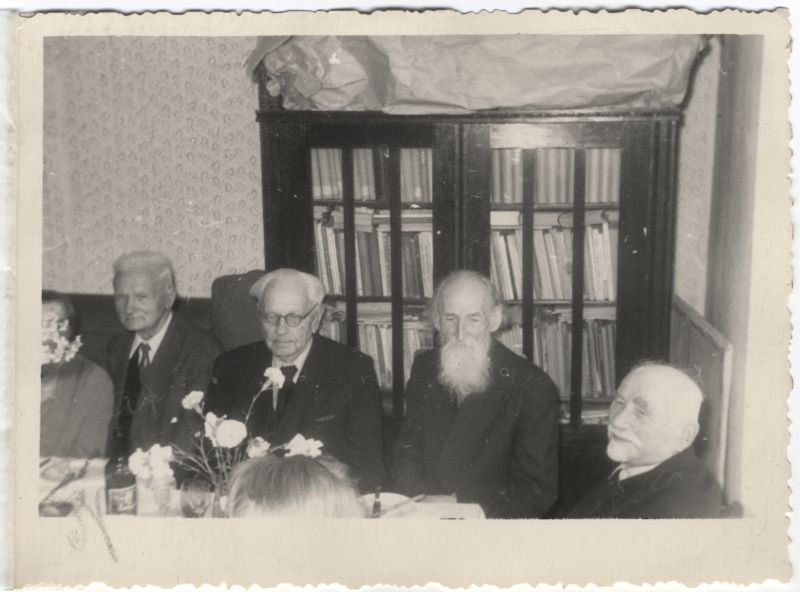No labās A. Skroderis un A. Dzeivers. Grāmatu skapis. Grupas portrets