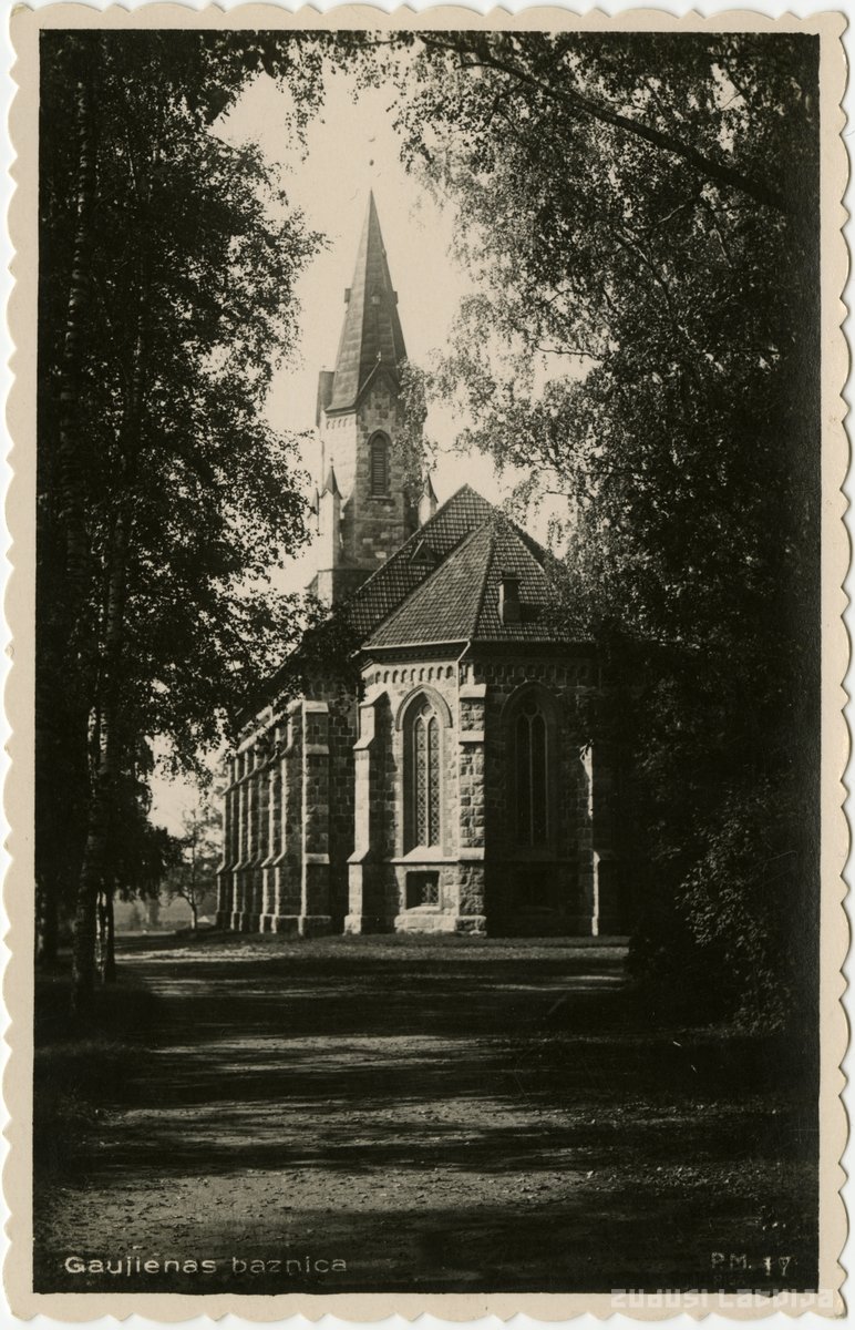 Gaujienas luterāņu baznīca 1935. gadā. Ēka pastāvēja laika posmā no 1891. gada 31. oktobra līdz Otrajam pasaules karam, kad tika uzspridzināta