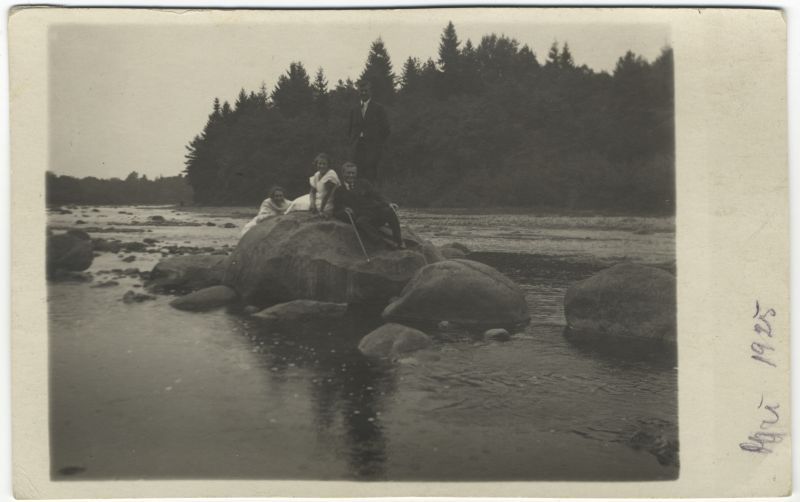 Divi jauni vīrieši tumšos uzvalkos un divas meitenes baltos tērpos uz viena no Ogres upes akmeņiem. Jaunietim rokā spieķis