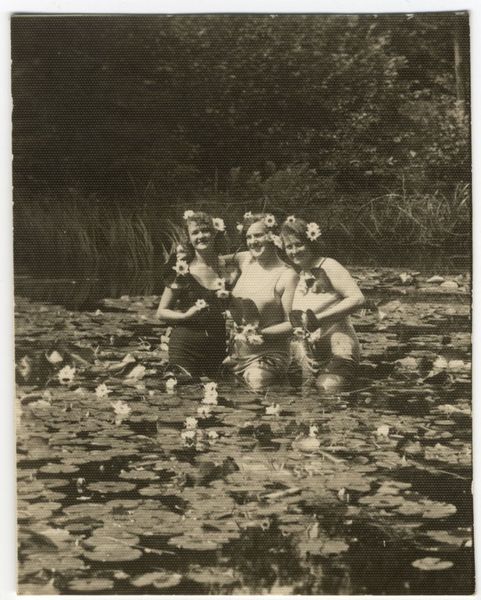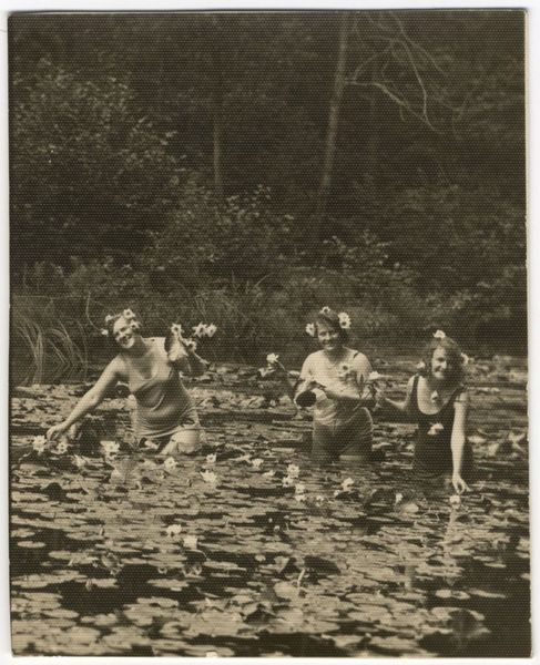 Trīs jaunas sievietes upē vai ezerā ar ūdensrozēm. Peldkostīmi