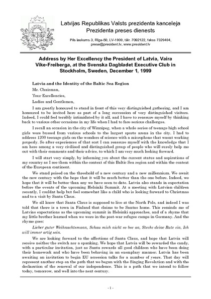 Address by Her Excellency the President of Latvia, Vaira Vike-Freiberga, at the Svenska Dagbladet Executive Club in Stockholm, Sweden, December 1, 1999