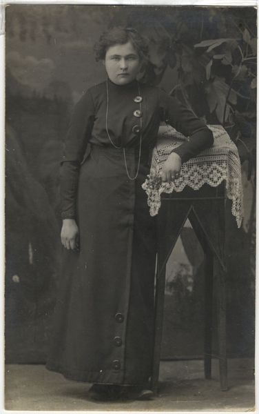 Jaunā sieviete, iespējams, pedagoga A. Skrodera māsīca Alma. Fotografēts foto salonā. Koka statīvs. Izšūta sedziņa. Dekoratīvs fons. Telpaugi