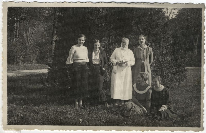 Četras sievietes stāv, divas sēž zālītē. Sieviešu grupas portrets