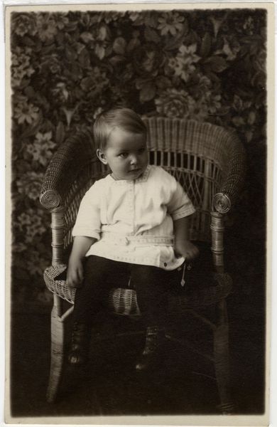 Jānis Skroderis, pedagoga A. Skrodera brālēna Alfrēda dēls, 1,5 gada vecumā. Sēž pītā krēslā. Dekoratīvs fons ar augu motīviem