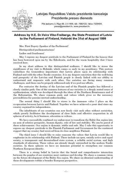 Address by H.E. Dr.Vaira Vike-Freiberga, the State President of Latvia to the Parliament of Finland, Helsinki the 31st of August 1999