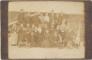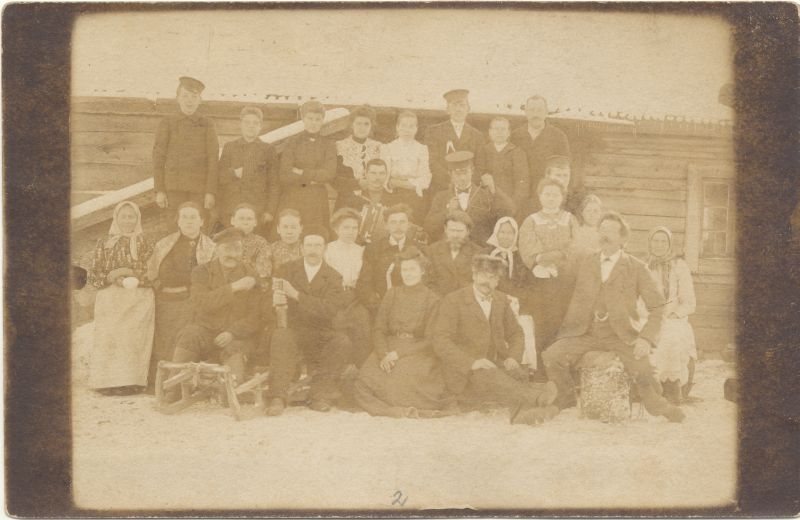 Kāzinieku grupa Elkšņu māju pagalmā. Ancis Bražs sēž pirmais no kreisās ar naģeni galvā un kreiso kāju ragavās. Cirsiene, saimniece, sēž pirmajā rinā pirmā no labās. Kamanas. Bajāns