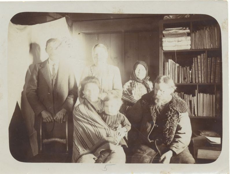 Sēž tēvs, Anna ar mazo Jānīti, stāv Ādams, Emilija un Cirsiene. Grāmatu plaukts