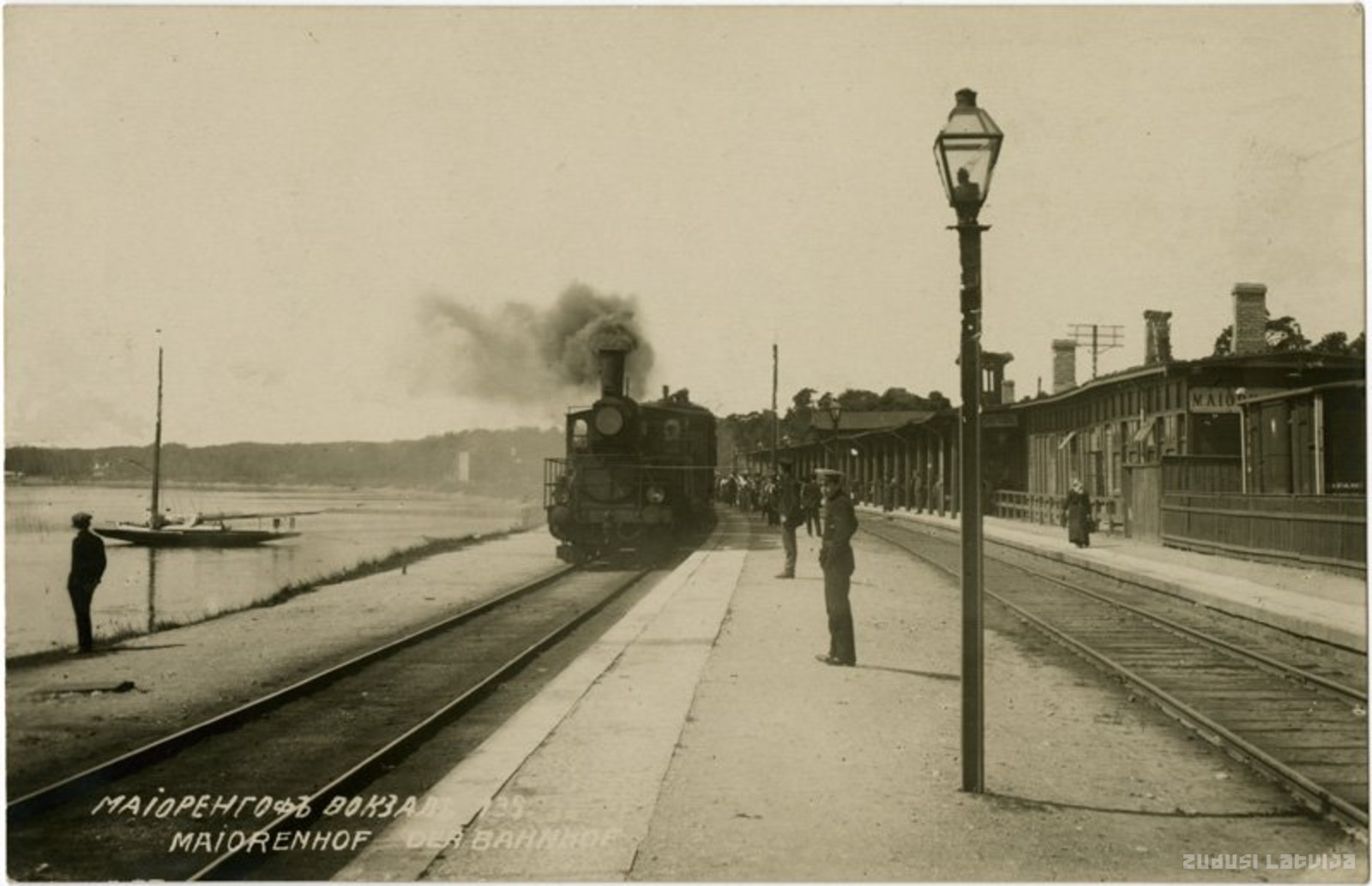 Atklātnes apakšējā kreisajā stūrī uzraksts: "Маiорегофь Вокзаль. Maiorenhof der Bahnhof"
