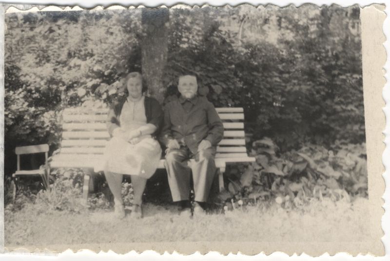A. Skroderis dārzā uz soliņa, iespējams, kopā ar kādu radinieci. Dārzs. Sols. Krēsls
