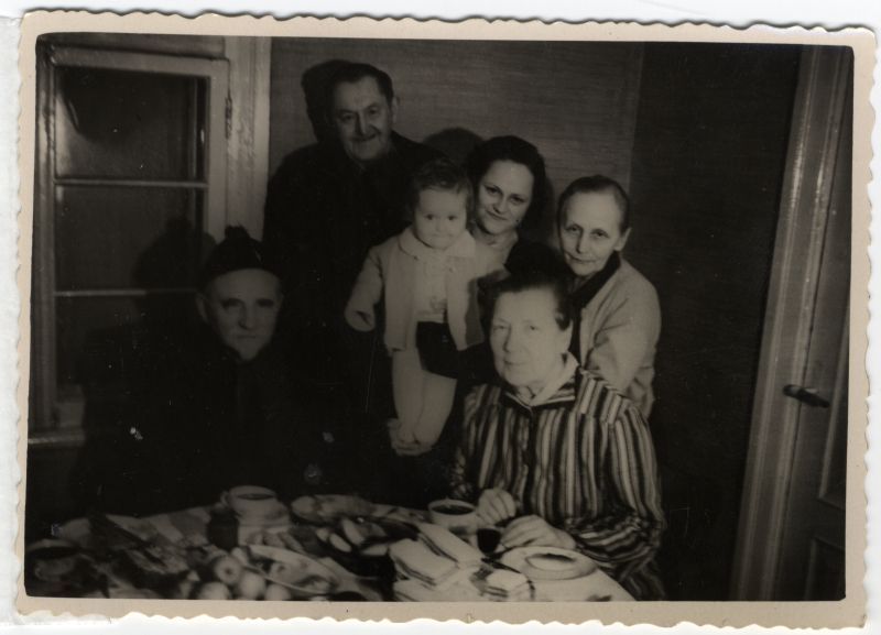 Pedagogs A. Skroderis kreisajā pusē, sēž istabā pie klāta galda, sieva Marta Skrodere sēž labajā pusē. Zīdainis