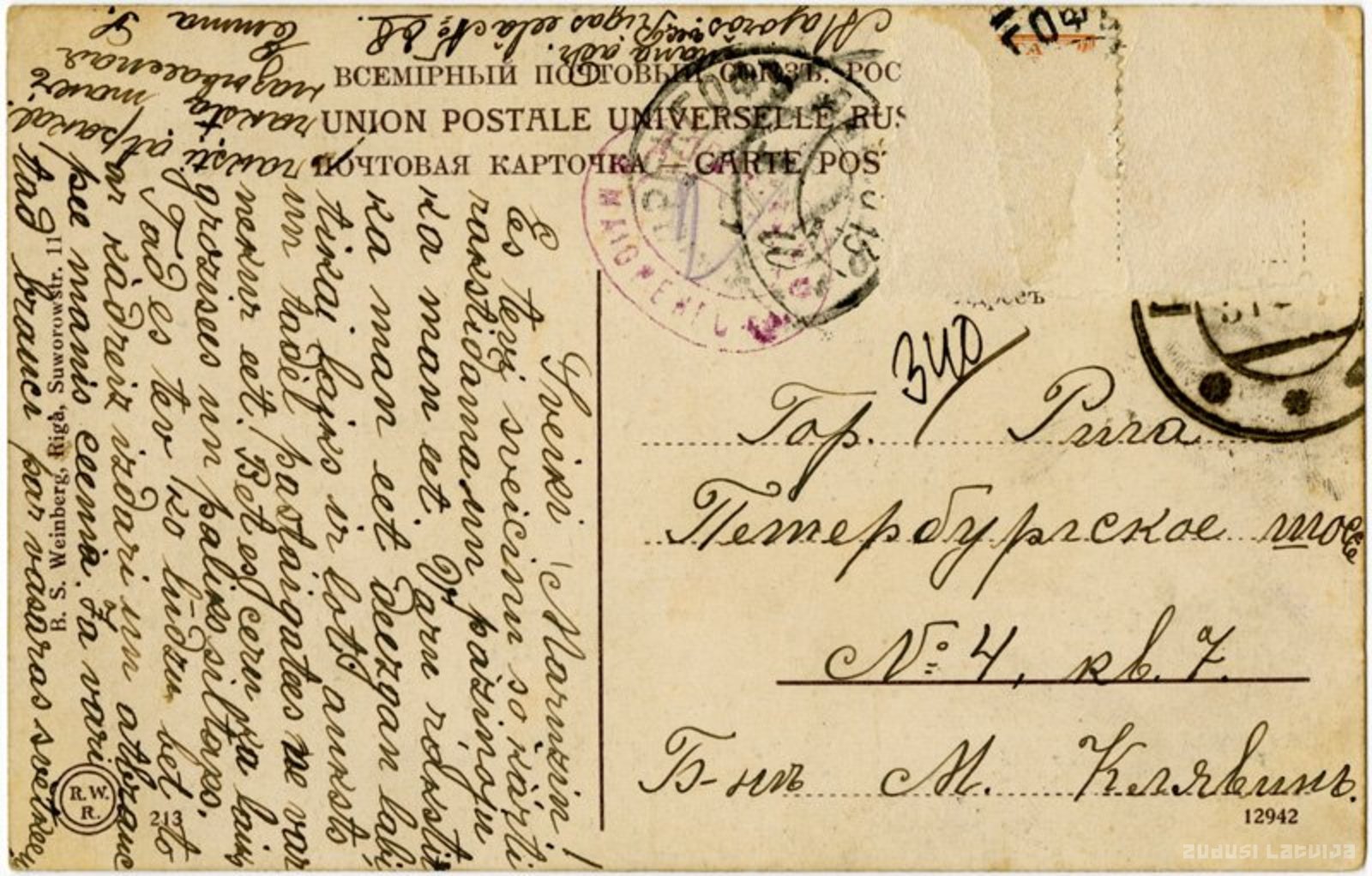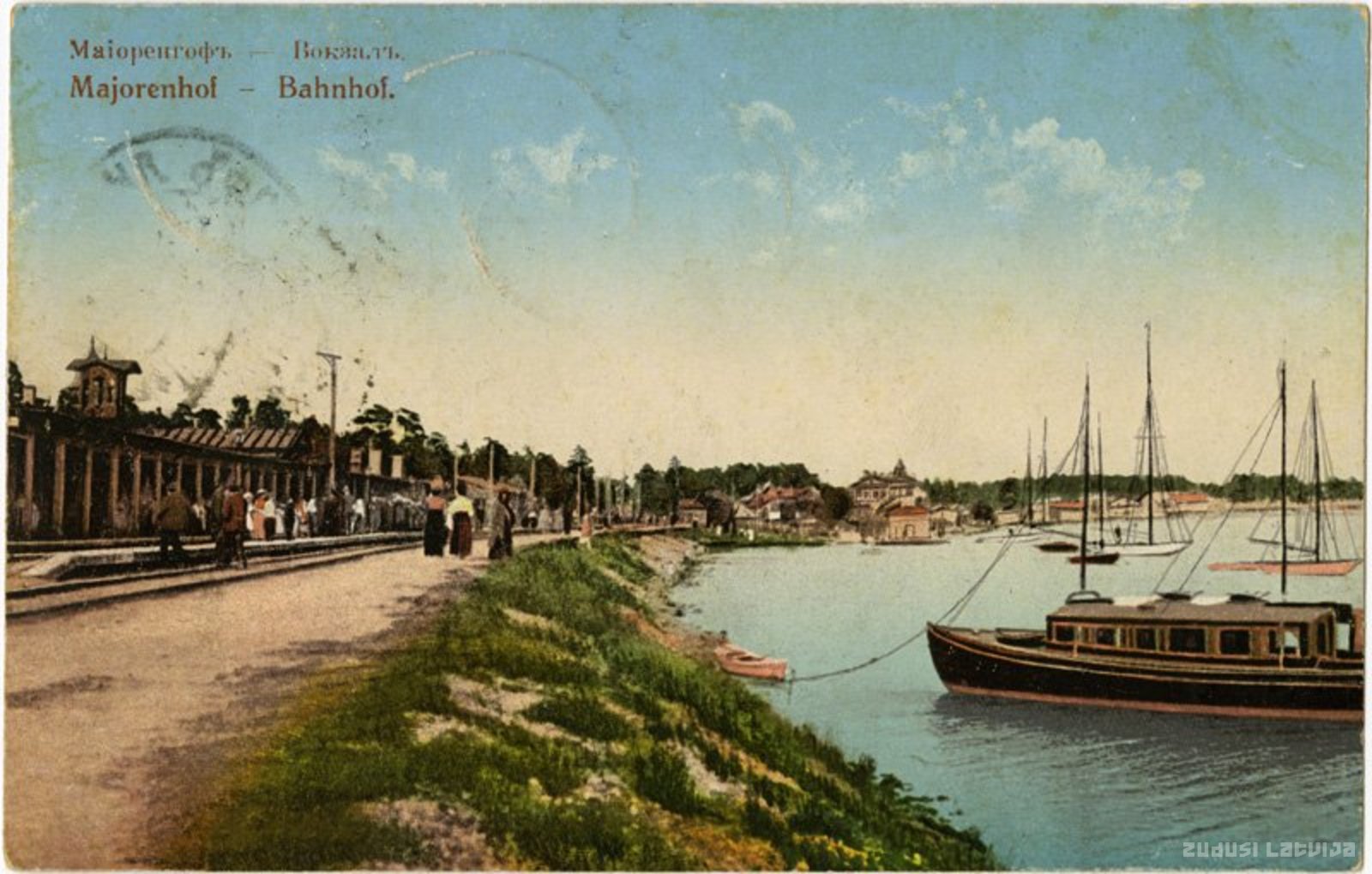 Atklātnes augšējā kreisajā stūrī uzraksts: "Маiорегофь -Вокзаль. Majaorenhof - Bahnhof"