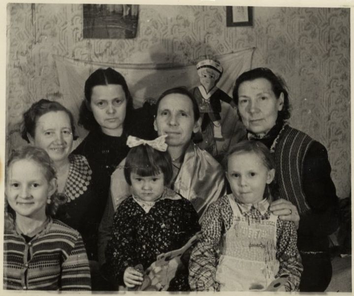 M. Skrodere (sēž labajā pusē pirmā). Sievietes un bērni, iespējams, radinieces. Tapetes. Sienassega