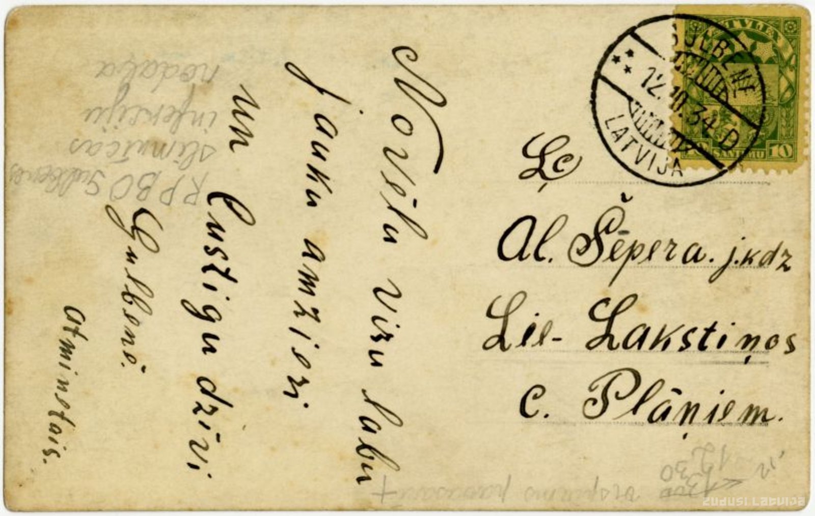 Atklātnes otrajā pusē ieraksts: "Ļ. Al. Šēpera jkdzei. Lie. Lakstiņos c. Plāņiem "