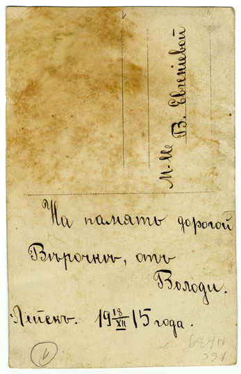 Fotogrāfijas otrajā pusē dāvinājuma ieraksts Veronikai Jevgenjevai Leiskā 1915. gada 18. decembrī krievu valodā