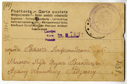 Pētera Radziņa apsveikums krusttēvam (tēva brālim) Ādamam Radziņam 1905. gada Lieldienās. Atklātne adresēta Ādamam Radziņam Vidzemes guberņā, caur Valkas pilsētu Lugažu pagasta Jaunvīndedzēs. Atklātne sūtīta no Ostrovas. Pēteris Radziņš šajā laikā (1905. gadā) dienēja Krievijas armijas Ostrovā izvietotajā karaspēka daļā