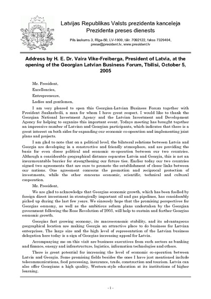 Address by H. E. Dr. Vaira Vike-Freiberga, President of Latvia, at the opening of the Georgian Latvian Business Forum, Tbilisi, October 5, 2005