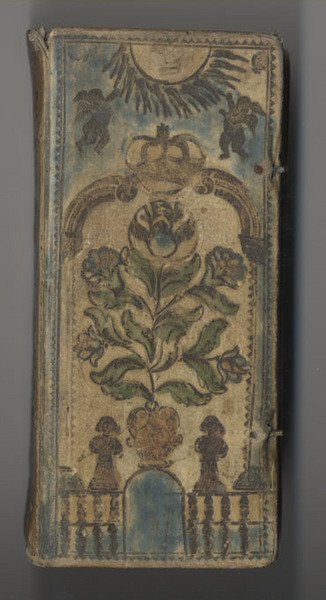Nukas formāta grāmatas iesējums: krāsots un lakots pergaments ar iespiestiem grezniem krāsainiem rotājumiem ar ziedu motīviem. Zeltīts un ornamentēts griezums