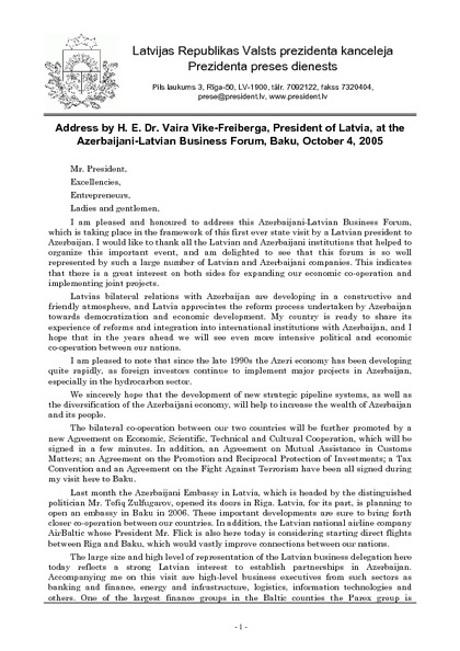 Address by H. E. Dr. Vaira Vike-Freiberga, President of Latvia, at the Azerbaijani-Latvian Business Forum, Baku, October 4, 2005