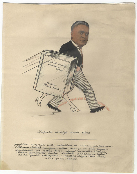 Paraksts: "Profesora uzticīgā mūza. Jautrības allēgorijas velte, iecienītam un mīļam profesoram Pēteram Šmita kungam, intīmo draugu un viesu pajautrināšanai pa svētku brīvi, līgsmi atceroties Kultūras Fonda godalgotā darba "Latviešu pasakas un teikas" darba gadu kārtojumu. - Jautrais Rīgas žurn. Priede, 1938. gadā, aprilī."