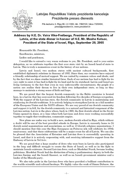 Address by H.E. Dr. Vaira Vike-Freiberga, President of the Republic of Latvia, at the state dinner in honour of H.E. Mr. Moshe Katsav, President of the State of Israel, Riga, September 20, 2005
