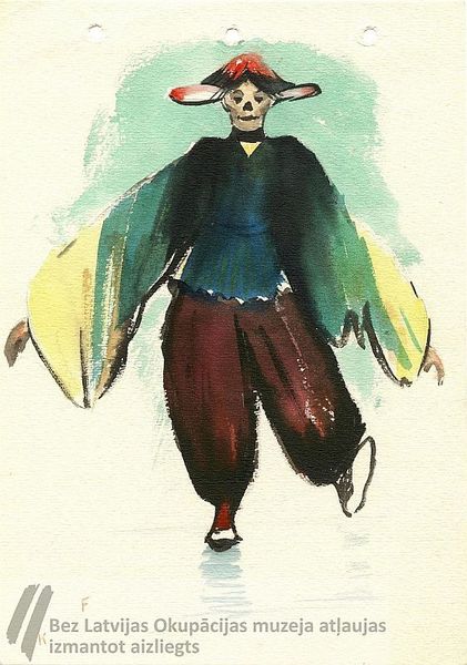 Attēlā - uz fragmentāra zaļa fona uz vienas kājas pa ledu slīdošs klauns. Raibs apģērbs ar platām zaļi dzeltenām piedurknēm, galvā sarkana plata cepure, kas pēc formas tagādina sēni. Lapas augšējā malā trīs caurdūrumi no bloka iesējuma. Apakšā pa kreisi, izvietoti slīpā līnijā atstatu viens no otra, autora iniciāļi K un F ar brūnu akvareli. Noformēts glabāšanai. K. Fridrihsons zīmēja skici ieslodzījuma laikā labošanas darbu nometnē Omskā, izmantojot papīru un akvareļa krāsas, ko no Latvijas sūtīja sieva Zenta Fridrihsone.
