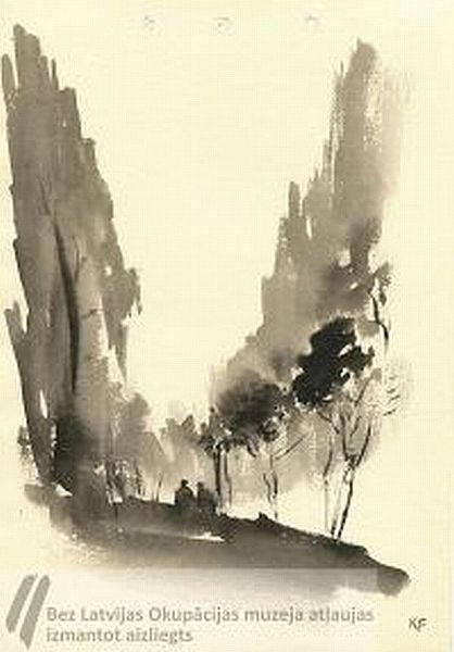parasto zīmuli nosaukums; pa labi autora iniciāļi KF ar melnu akvareli. Noformēts glabāšanai. K. Fridrihsons zīmēja skici ieslodzījuma laikā labošanas darbu nometnē Omskā, izmantojot papīru