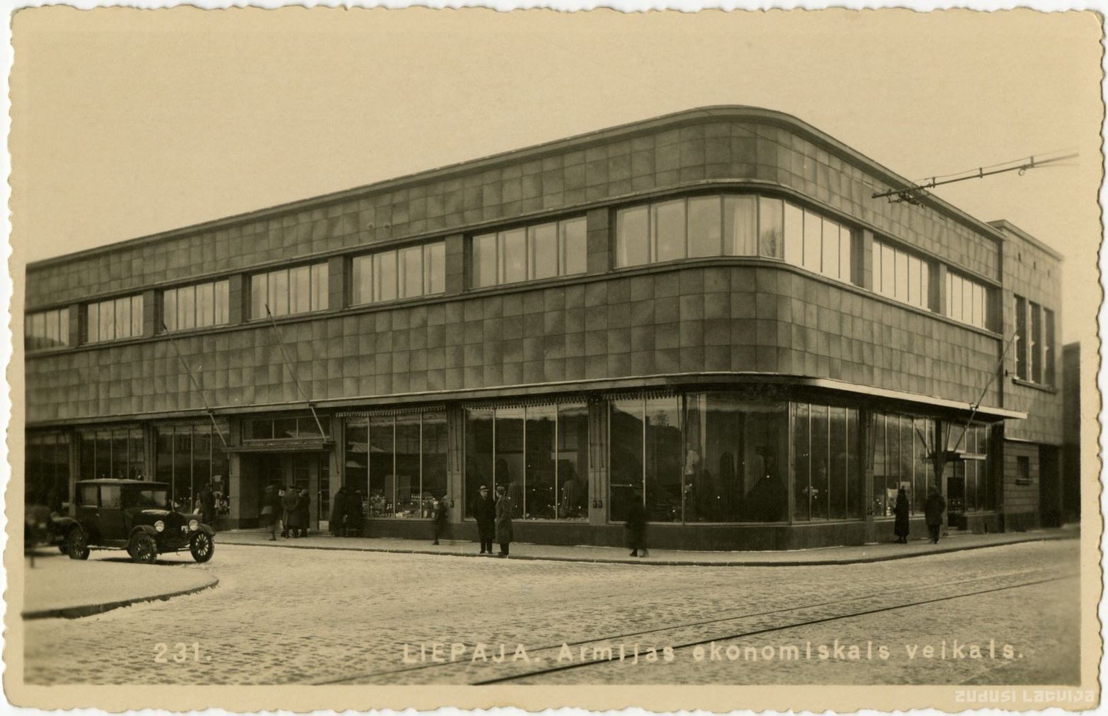 Armijas ekonomiskā veikala ēku pēc arhitekta Aleksandra Rāceņa projekta uzcēla 1934. līdz 1935. gadam, bet sagrāva Otrā pasaules kara laikā