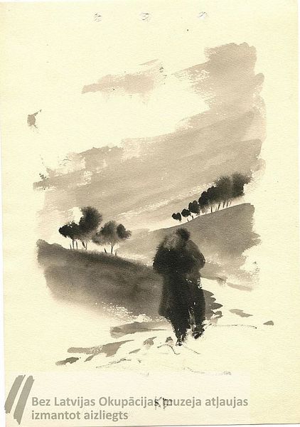 kreisi ar zīmuli; vidū autora iniciāļi KF ar melnu akvareli. Noformēts glabāšanai. K. Fridrihsons zīmēja skici ieslodzījuma laikā labošanas darbu nometnē Omskā, izmantojot papīru un