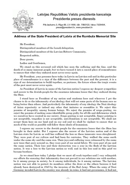 Address of the State President of Latvia at the Rumbula Memorial Site