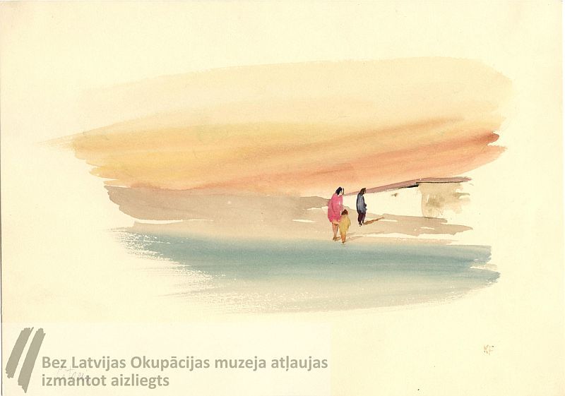 Attēlā - tuksnesīga ainava. Pa labi pie zemas baltas ēkas ar plakanu jumtu trīs figūras: dziļumā vīrietis, tuvāk sieviete ar bērnu. Apakšā pa kreisi ar ar parasto zīmuli nosaukums; pa labi iniciāļi KF ar brūnu akvareli. Apakšā pa kreisi autora iniciāļi KF ar zīmuli. Noformēts glabāšanai. K. Fridrihsons zīmēja skici ieslodzījuma laikā labošanas darbu nometnē Omskā, izmantojot papīru un akvareļa krāsas, ko no Latvijas sūtīja sieva Zenta Fridrihsone.