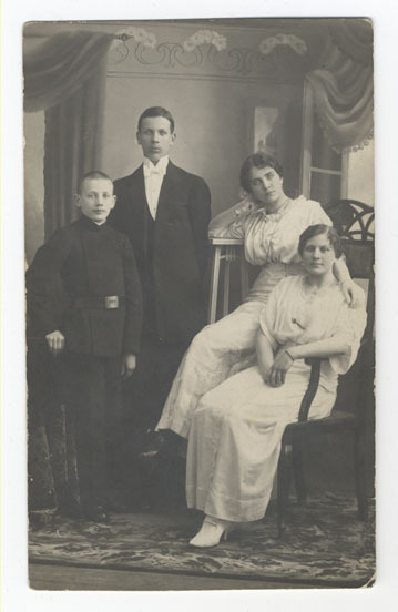 Pāvis Vīlips, vēlākais rakstnieks, redzams kopā ar brāli Voldemāru (pirmais no kreisās), māsām Olgu un Irmu. Pāvils ģērbts ģimnāzista formā, māsas - gaišos tērpos